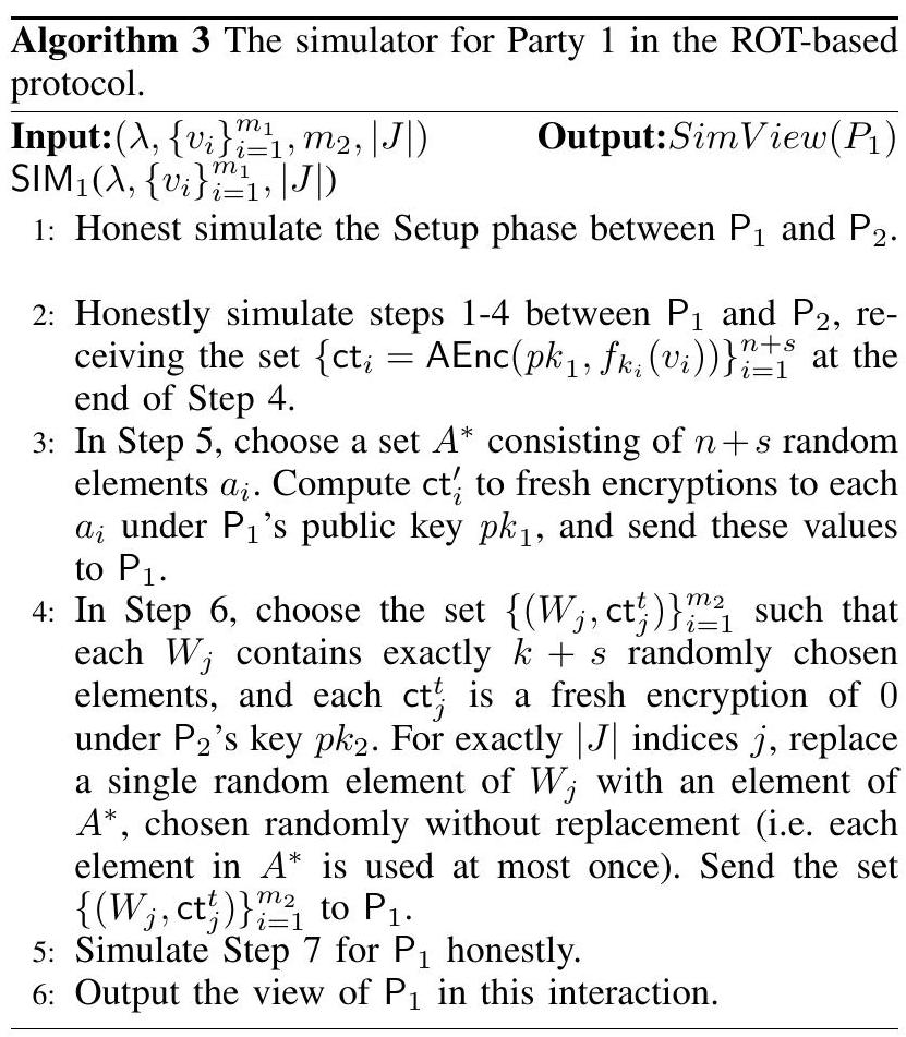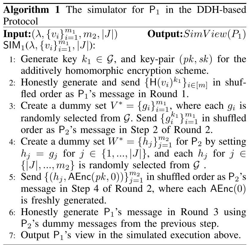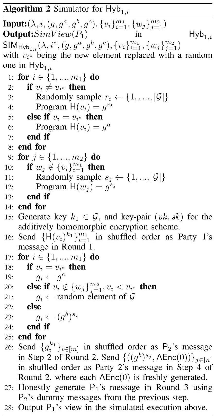 证明。我们在算法 1 中描述了模拟器算法。请注意,在第 2 轮中,与实际协议执行的主要区别在于,不是像实际执行一样发送,而是使用具有相同大小交集的随机群元素,以及加同态加密的 0。