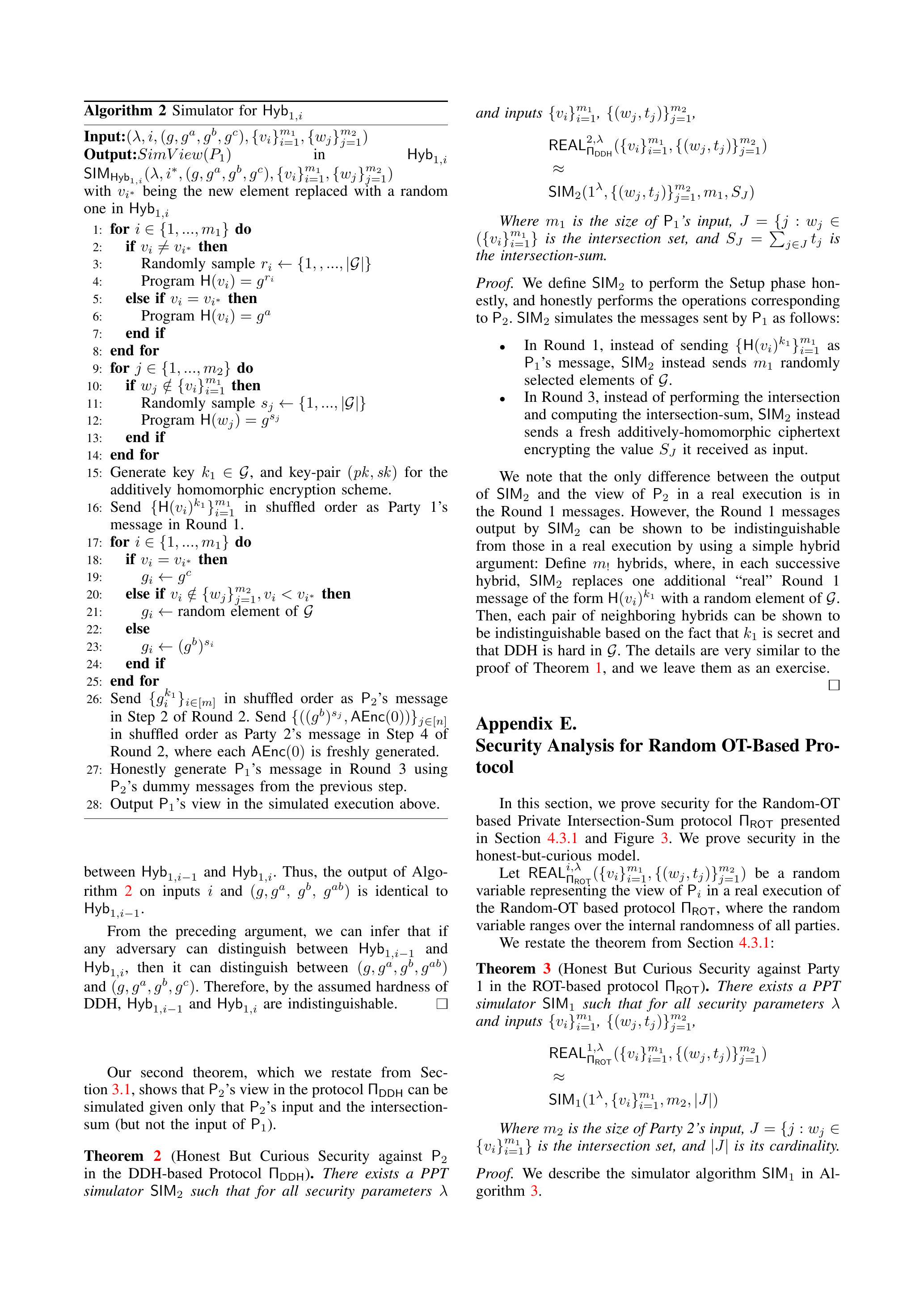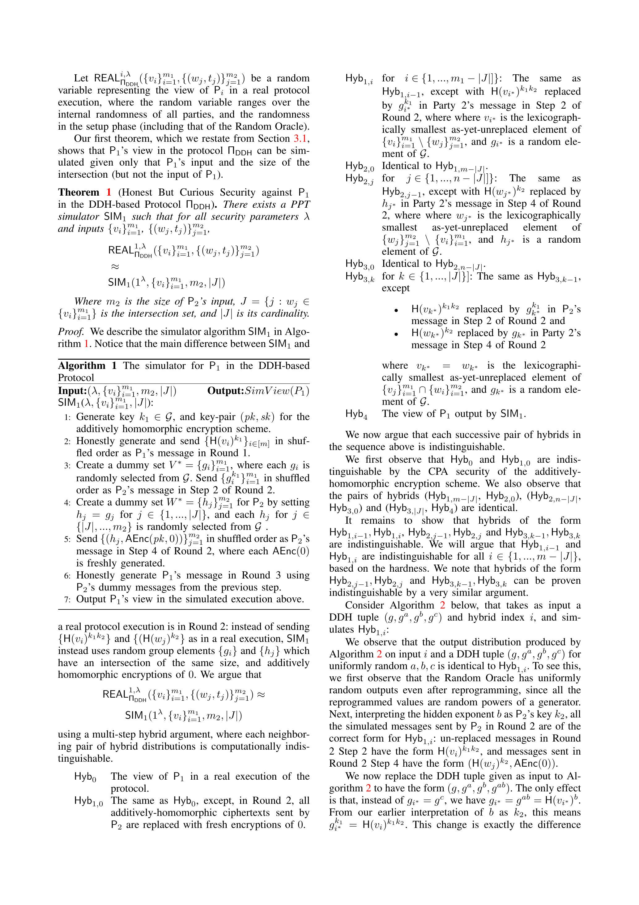 我们在下面陈述安全性的定理。诚实但好奇的模型中的正式安全证明出现在附录 D 中。他们表明,每一方只学到了交集大小和交集和。证明使用了一个标准的混合论证,表明每一方的观点可以通过用假值替换 "真实" 的协议值来模拟,同时保持相同的交集大小和,并且根据 DDH 的假定硬度和同态加密方案的安全性,假值与真实值是不可区分的。